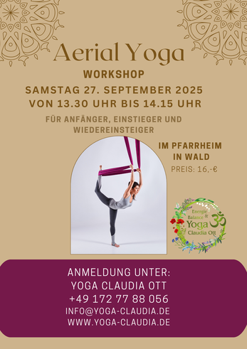 Ab dem 07. Oktober bis 25. November 2025 findet Aerial Yoga als Wöchentlicher Kurs statt. Aktuell sind noch 2 freie Plätze. (Ist nur für Teilnehmer geeignet, welche an einem Workshop teilgenommen haben).